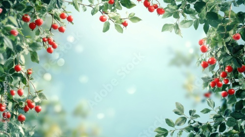 Tranquil botanical frame with vibrant red berries against ethereal bokeh backdrop
