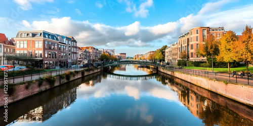 Tranquil Canal Reflects City Buildings and Autumn Trees under a Cloudy Blue Sky Tranquilly in the City