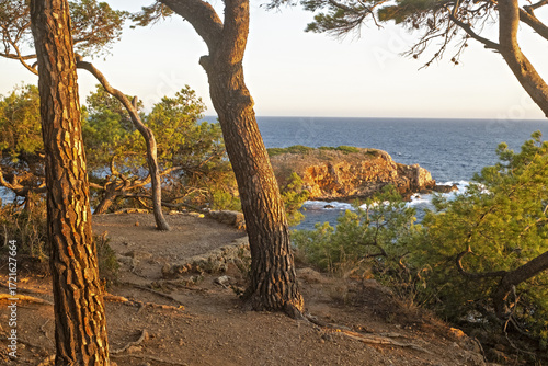 tranquil coastal landscape with a small island in the distance surrounded by calm blue sea. In the foreground, lush green trees and vegetation cover a sunlit hillside, ,in Bandol harbour, France