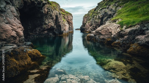 Tranquil, crystal-clear cove nestled between dramatic rock formations
