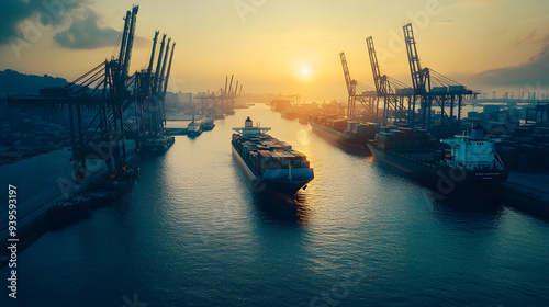 Tranquil dawn break at the harbor, ships at dock and cranes busy loading containers, symbolizing the start of a new day in global trade.