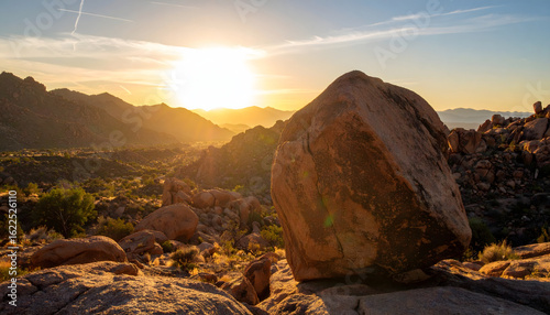 Tranquil Desert Sunset with a Large Boulder and Mountain Silhouettes