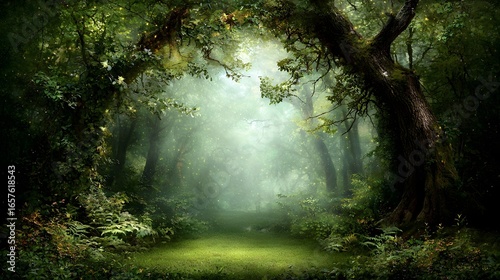 Tranquil Enchanted Forest with Mist and Lush Greenery in Soft Light