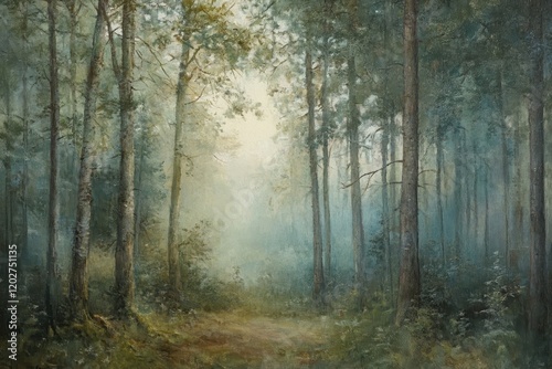 Tranquil Forest Path Impressionist Oil Painting of a Misty Woodland Scene.