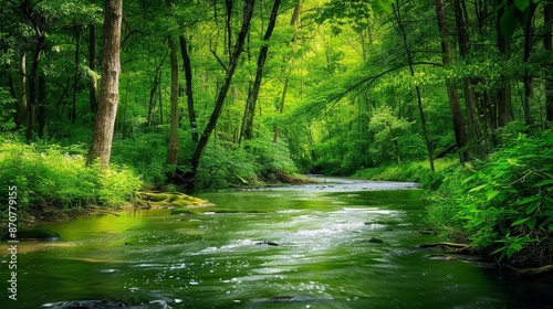 Tranquil Forest Stream in Vibrant Green Hues - A peaceful forest scene featuring a flowing stream amidst lush green foliage, capturing the beauty of nature's tranquility. - A peaceful forest scene fea