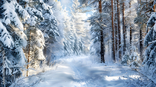Tranquil Forest Wonderland: Majestic Pines and Pristine Snow Under a Brilliant Blue Sky