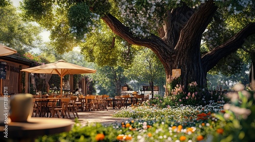 Tranquil Garden Cafe: A picturesque outdoor cafe nestled amidst vibrant blooms and a majestic oak tree. Sunlight dances through the leaves, casting dappled shadows on the tables and chairs.