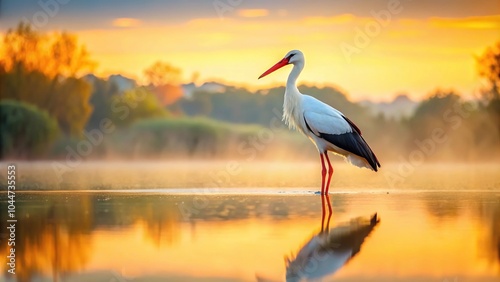 Tranquil image of a white stork by the water at dawn