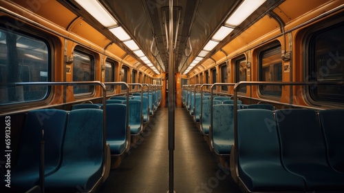 tranquil interior of an empty train carriage, a peaceful ride on public transit