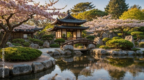 Tranquil Japanese Garden: Cherry Blossoms, Waterfall, and Traditional Architecture