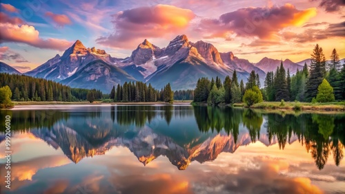 Tranquil lake mirrors majestic mountain range bathed in soft pinkish hues
