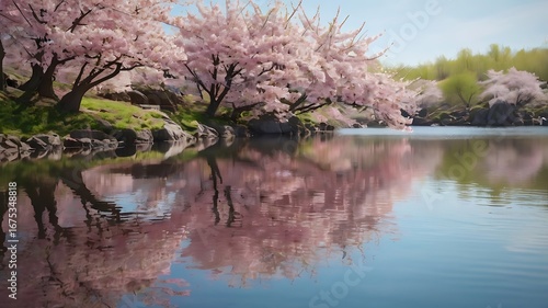 Tranquil lake reflecting blooming cherry blossom trees in soft pink springtime light