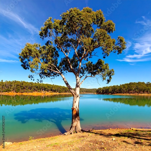 Tranquil lake scene with a lone tree
