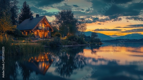 Tranquil Lakeside Haven at Dusk with Reflective Water and Scenic View