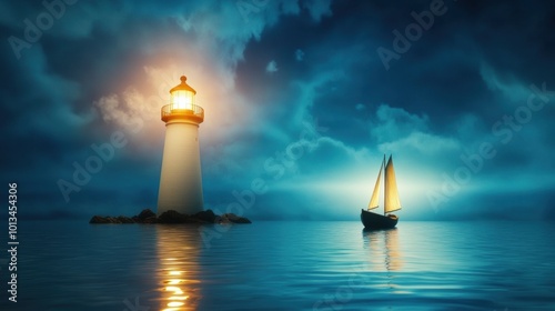 Tranquil Lighthouse and Sailing Boat at Dusk