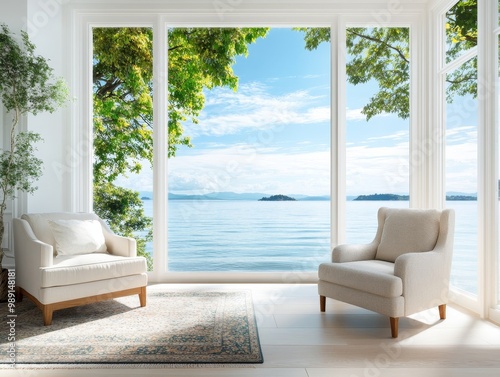Tranquil Living Room with Breathtaking Sea View and Lush Greenery Surroundings