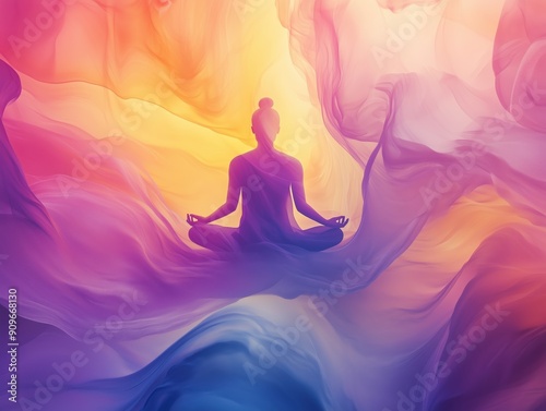 Tranquil Meditation in Abstract Harmony - Serene person in lotus pose embraced by flowing colors and gentle light
