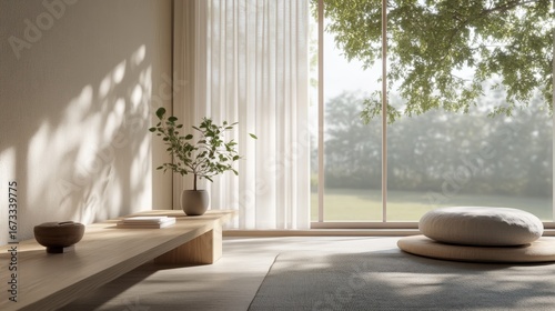 Tranquil minimalist interior with natural light and a zen-like aesthetic.