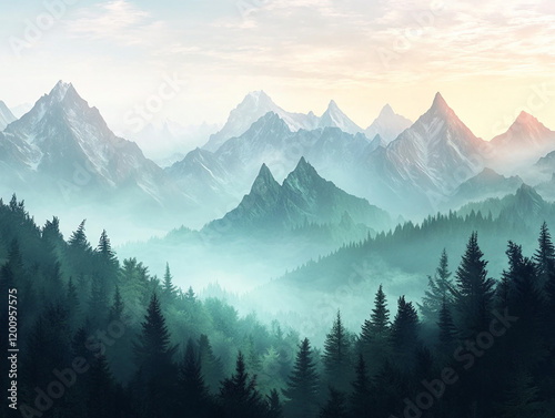 Tranquil Misty Mountain Landscape with Dense Green Forests