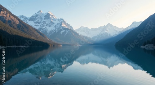 Tranquil mountain lake capturing stunning reflections of towering snow-capped peaks at dawn