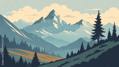 Tranquil Nature Scene of Mountains and Trees Silhouette