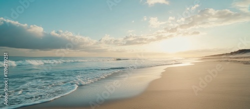 Tranquil ocean view with gentle waves lapping on a sandy beach under a beautiful sky at sunrise or sunset.