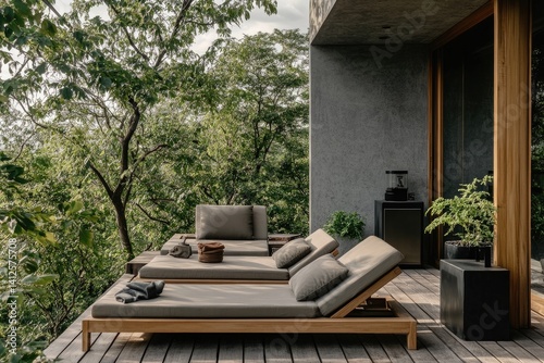 Tranquil outdoor lounge with teak daybeds, offering lush forest views