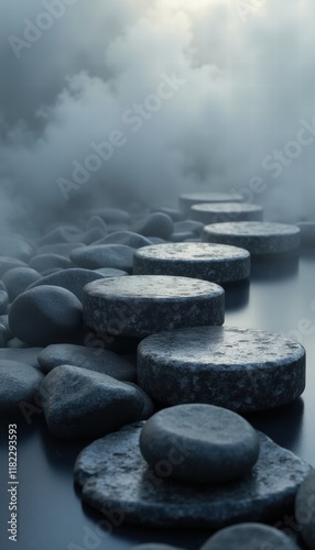 Tranquil pathway of stone circles surrounded by mist, evoking a sense of peace and contemplation, ideal for wellness, meditation, and spa-themed projects.