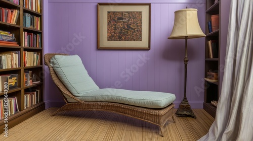 Tranquil Reading Nook with Lavender Walls and Bamboo Floor