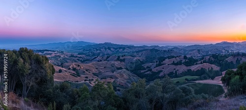 Tranquil rural sunset scene with rolling hills, ideal for text placement in peaceful landscape