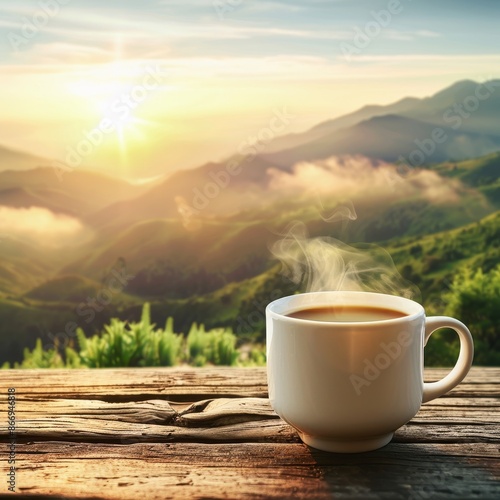 Tranquil scene white coffee mug on wooden table with steam, green landscape blur