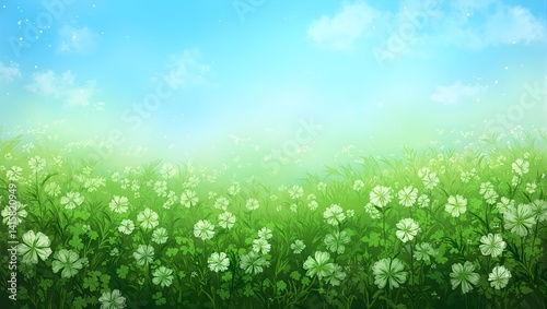 Tranquil scene of clover meadow under clear blue sky delicate white blossoms covering lush green landscape