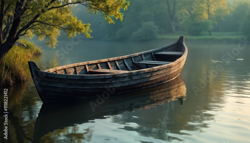 Tranquil scene of old wooden boat resting on calm riverbank. Foggy morning mist subtly covers landscape. Nature beauty evident in reflection of trees, sky on still water. Peaceful, serene atmosphere