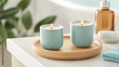 Tranquil Scene with Blue Candles and Relaxing Spa Accessories on Table