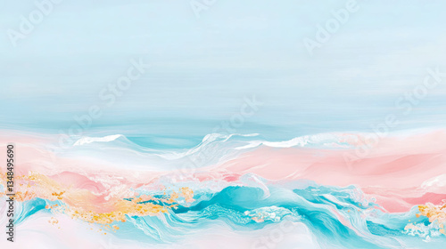 Tranquil Seascape in Pastel Hues with Golden Accents: Fluid Art Depicting Ocean Waves and Sandy Shores for Wall Art or Serene Decor
