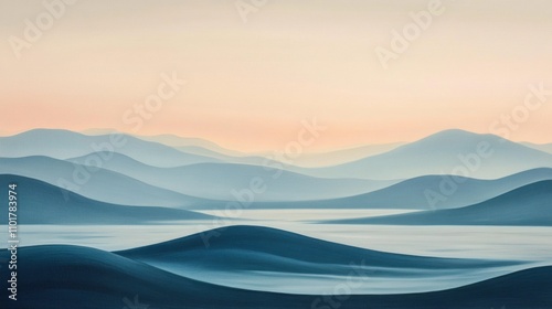 Tranquil seaside scene with undulating hills fading into the distance, framed by a pastel-colored horizon.