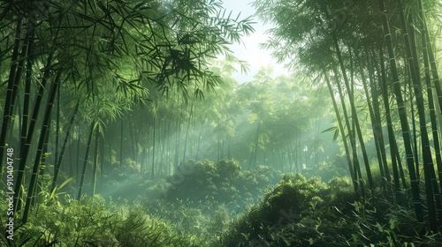 Tranquil sections of bamboo forest habitat in the natural woodland environment