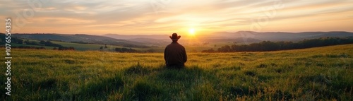 Tranquil Silhouette of a Man in Golden Hour Light Against a Countryside Sunset, Serene Landscape Photography