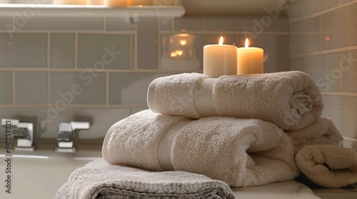 Tranquil Spa Ambiance - Stack of Fresh Towels and Scented Candles in Renovated Bathroom