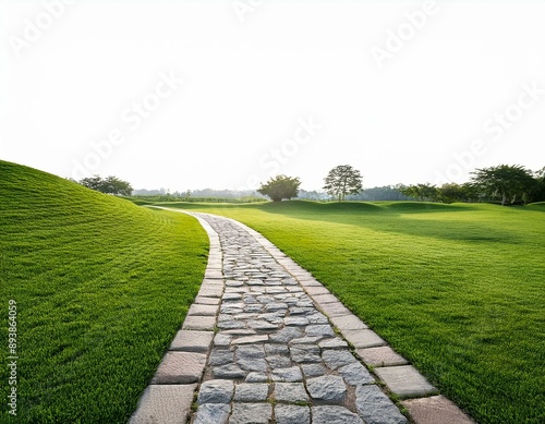 Tranquil stone walkway in lush green field against white backdrop, perfect for landscape design inspiration.