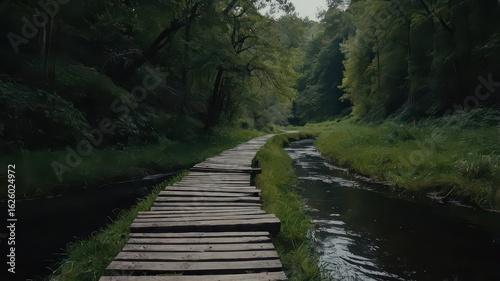 "Tranquil Stream Flowing Through a Shaded Forest"