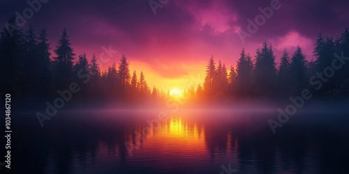 Tranquil summer forest with a serene lake and a vibrant sunset sky in the background, Serene forest landscape with tranquil lake and vibrant sunset sky
