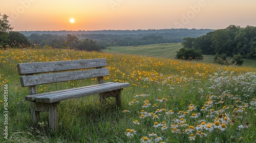 Tranquil Sunrise View Over Flower Field with Wooden Bench in Serene Landscape Setting