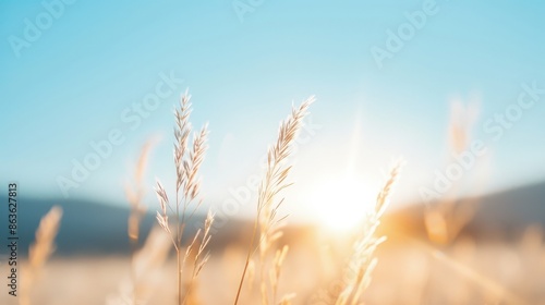 Tranquil Sunrise/Sunset Scene with Vibrant Grasses and Blurred Mountains
