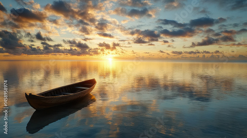 Tranquil sunset light across calm tropical bay with boat silhouetted against horizon