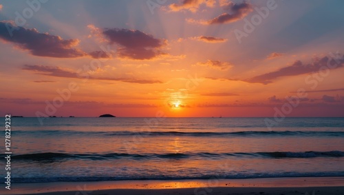 Tranquil Sunset Over Calm Ocean Waves At Tropical Resort Beachscape