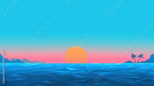 Tranquil Sunset Over Ocean with Silhouette of Palm Trees and Islands