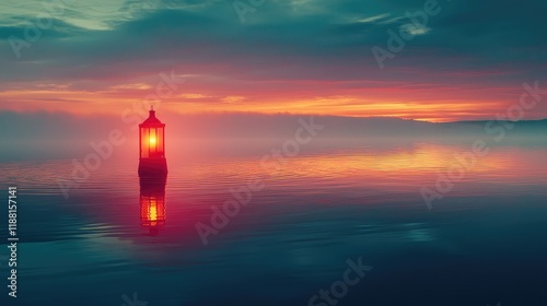 Tranquil Sunset Over Water with Illuminated Lantern Reflection