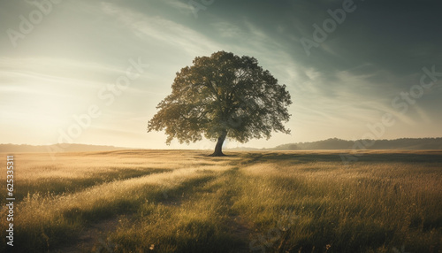 Tranquil sunset silhouettes tree on rural horizon over meadow generated by AI