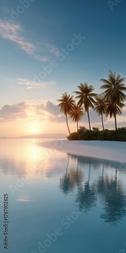 Tranquil tropical beach sunrise with palm trees and reflection on calm ocean